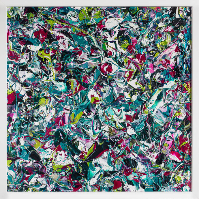 Influenced by the legendary Jackson Pollock and the bold spirit of abstract expressionism, each unique piece in this collection results from an energetic and spontaneous process. Working quickly and instinctively, I move around the horizontal canvas, throwing, layering and dripping pure acrylic paint directly onto the surface, revelling in the mesmerising contours of colour and enticing forms that emerge.